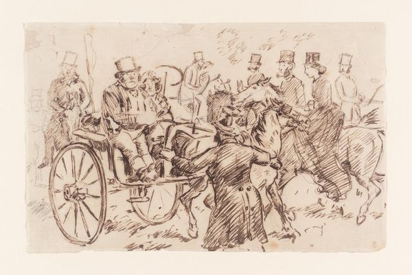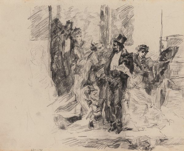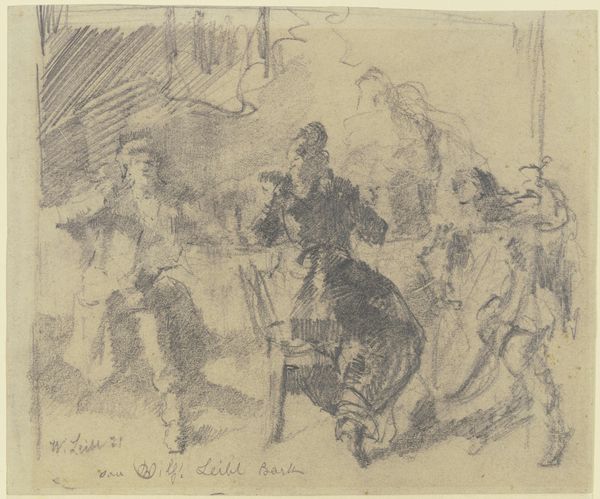 Editor: So, this is "Café," a 1912 ink drawing by Max Beckmann. The scratchy, almost frantic lines give it a really anxious, crowded feel, don't you think? What jumps out at you when you look at it? Curator: Anxious, yes, and crowded! It feels like being in a room where everyone is talking but nobody's listening, doesn't it? This was Beckmann's pre-war period and there's a tension here. Have you ever noticed how he uses light and shadow? It's almost theatrical, casting some figures in a harsh light while others recede into darkness, as though masking away from society. Editor: The stark contrast definitely adds to the mood. So, the dark shading represents isolation and fear? Curator: Not necessarily fear, but definitely alienation. Remember, this is German Expressionism; artists were interested in capturing the inner emotional landscape, and, here, perhaps, a shared social unrest, and what's more is that each figures stands alone, trapped within this moment, each expressing what would become commonplace by 1914. What do you make of the positioning of the figures? The faces in profile? The figure slumped low beneath the cafe table in the bottom left corner? Editor: It's interesting that most of the faces are averted. It makes the viewer feel like an outsider looking in – or perhaps like everyone *inside* is an outsider, disconnected. Like it's an idea that perhaps the war broke individuals, perhaps before its coming. The huddled person definitely supports that idea, like social trauma put onto paper. Curator: Precisely! There is a feeling of disharmony in public gathering - or possibly a prescience. Beckmann wasn't just showing us a café; he was showing us a feeling. So much can be hidden in a simple, intimate study of a place... it makes you wonder, what would one small café or corner shop drawing mean to another viewer a hundred years into the future? It's like capturing emotion. Editor: That's so true. I'll never look at a simple sketch the same way again! I was looking at lines but there is this entire world of interpretation.