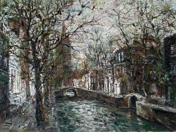 Editor: We’re looking at “Ampus,” an oil painting by Włodzimierz Zakrzewski from 1982. It's a cityscape with prominent trees, rendered with a thick impasto technique. The colours are earthy but luminous, creating this almost vibrating texture across the canvas. What do you make of it? Curator: Well, immediately, I'm drawn to the sheer materiality of the paint. Zakrzewski’s use of impasto isn’t just about depicting the scene; it's about making the labour visible. Think about the physical effort involved in building up those layers of oil paint. The brushstrokes themselves become part of the content. Editor: That's interesting. It feels like more than just representing trees; it's almost a sculpting of them with the oil paint itself. Curator: Exactly! And it’s vital to consider the context. Zakrzewski painted this in 1982, when the boundaries between "high art" like painting and more traditionally 'craft' practices were being questioned. This piece actively dissolves those boundaries. Is it landscape painting, or is it a kind of sculptural relief? What kind of tools do you think that he used and what does it say about consumption and materials at that time? Editor: So, you’re suggesting it's not just a painting *of* something, but a commentary *on* the act of painting, the tools of painting, and the whole cultural context of art making itself? It reminds me that the oil paints must be bought. What’s interesting to me is what parts are more impasto and what elements aren’t and why. It changes everything from how the light works to where your eye wants to go. Curator: Precisely! The way he manipulates the paint implicates the whole process of artistic production and consumption. Consider, too, the support—the canvas. How does the texture of the canvas contribute to our reading of the piece? Does it feel planned, like someone bought quality material, or ad-hoc and cheap. All things to think about to connect art to historical conditions. Editor: I hadn’t thought about the canvas. Thank you. Now I'm seeing so many more layers to consider – both literally and figuratively.