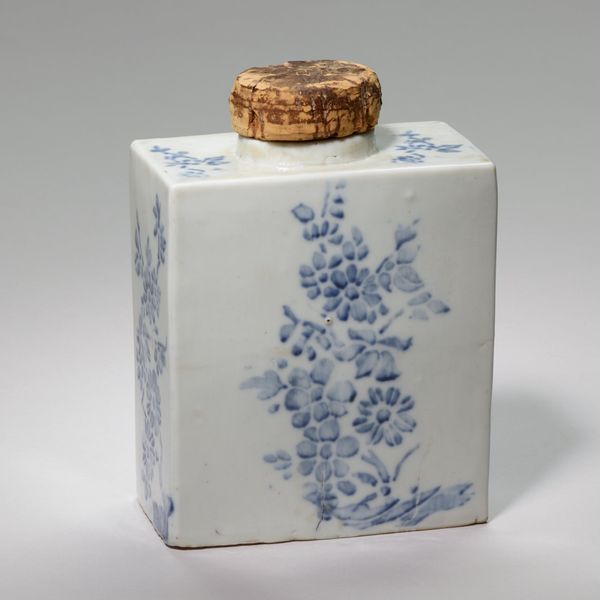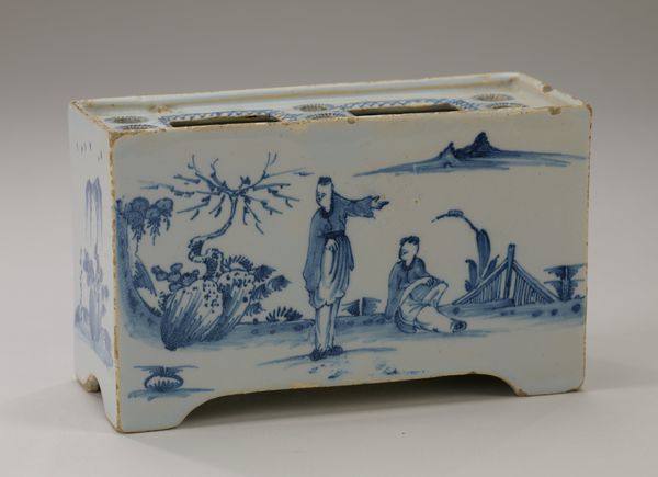 Editor: Here we have an earthenware "Bulb Pot" from around 1750. It's anonymously created in England. It's boxy, quite different than what I'd expect a planter to look like. The blue and white scene gives me a relaxed feeling. What do you make of it? Curator: I find the use of earthenware interesting, particularly in the 18th century. The ubiquity of readily available clay meant almost anyone could fashion useful objects. Its function isn’t purely aesthetic; it literally sustains life. What does it mean when we elevate such objects with painted landscapes, scenes normally reserved for "fine art"? Editor: So you’re suggesting the material itself changes the reading of the piece? Curator: Precisely! These bulb pots are simultaneously high art and low craft, disrupting rigid hierarchical boundaries. Look closely, what is being depicted? Miniature, generic landscapes are essentially being mass-produced here to ennoble the functional object. Note, it can mass-produced through printing techniques for applying the design or it may hand painted depending on time constraints. Editor: Now that you mention it, it’s interesting to think about how the labor involved in creating this impacts its meaning. Was this readily available? Curator: That’s another interesting question! The labour conditions behind even seemingly innocuous things, like this planter, reflect complex relations of production and consumption of the day. It prompts us to reflect on the socio-economic systems and hierarchies that enabled its existence. Editor: This was truly enlightening, I will definetly keep the production aspect in mind moving forward! Curator: Indeed! Thinking about production provides us with the opportunity to broaden our understanding of any given artwork!