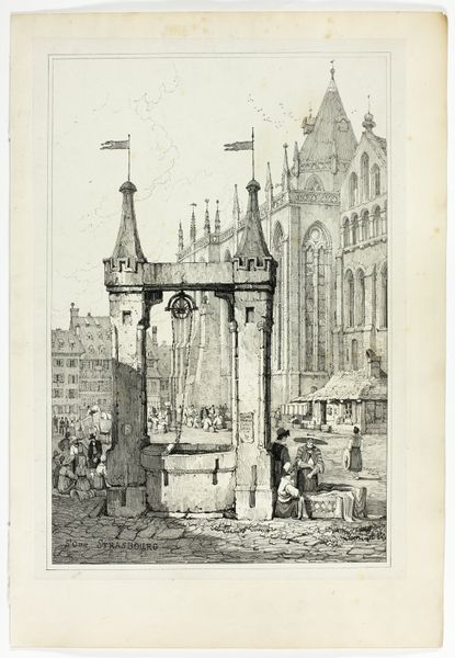 Samuel Prout's "Hotel de Ville, Brunswick" presents us with a highly detailed ink and graphite rendering of civic architecture. Prout was working during a period of significant social and political change in Europe. The rise of industrialization and urbanization transformed cities, while also preserving historical landmarks. Prout's artistic identity was shaped by his travels across Europe where he found inspiration in the architectural heritage of cities. This drawing, like many of his works, captures the grandeur of European architecture but it also subtly acknowledges the human element. Figures are included in the foreground which hints at the daily life unfolding within the shadow of these monuments. The choice of subject matter reflects the sense of cultural pride of the 19th century, and invites us to reflect on the relationship between individual experience and collective memory. This relationship is deeply felt in the detailed lines of the architecture. Prout invites us to consider how buildings speak to the cultural and historical context they are part of.