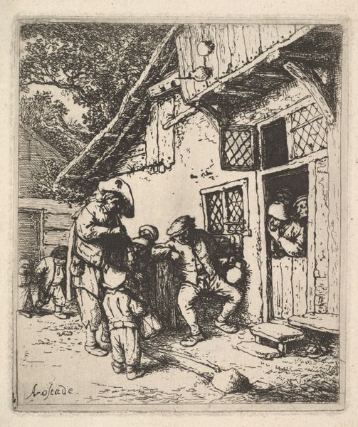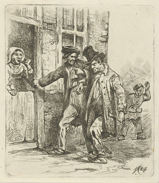 Curator: Welcome. Here we have Wilhelm Marstrand’s pen and ink drawing, *Gademusikanter*, which roughly translates to ‘Street Musicians’. It’s currently held here at the SMK, Statens Museum for Kunst. Editor: My first thought is the immediate sense of social observation captured by such detailed line work. There’s an almost satirical air, like a scene witnessed through a discerning eye. Curator: Indeed. The composition invites semiotic interpretation, doesn’t it? Observe how Marstrand positions the musicians within the architectural space, the clear structural division between the performers and the onlookers creates a hierarchy that is mediated by the child at the railing. Editor: What I find more engaging is how the image details the materiality of everyday life. We can almost feel the coarse fabric of the musician's clothing and the rough-hewn stone of the steps where the child stands and the chicken gathers. Look at the texture created by the quick, expressive lines. Curator: But aren't those lines deliberately arranged? The formal organization is central to its meaning, though. How the eye moves within the frame. Consider how the lamplight, architectural lines, and human forms interplay within a tightly considered space. Editor: I would argue that focusing solely on its aesthetic components ignores the work implied in its making. Pen and ink were affordable, and thus available; it represents not only his artistic vision, but the tangible reality of artistic production for the time. A reality that had certain materials within reach and others not. Curator: However, focusing on materiality at the expense of understanding structure diminishes Marstrand's artistic choices, his deliberate orchestration of visual elements. His use of perspective to convey narrative depth would not exist without his deliberate design, to see him only as a documentarian and his time through a selection of readily available and used resources dismisses a conscious intellect putting choices forward. Editor: Well, isn’t the relationship between form and material inextricably linked? What do you make of the rooster then, scratching away at the bottom? Another passer-by unconcerned about a higher order or the intended viewership for this scene? Is that an artist statement? Curator: Perhaps. It’s a thought-provoking element to the tableau for sure. The artist subtly guiding how we view his scene as something that also occurs whether we are there or not, existing both without and with the need of witness or interpretation. Editor: An excellent point to consider as we move forward. We see the convergence between artistic intention and the conditions of creation that shaped its realization, as it remains now over one hundred years later.