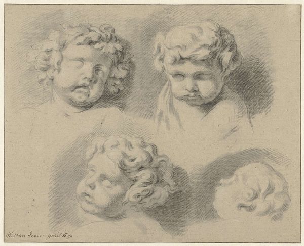 Jacob de Wit rendered these five studies of children’s heads in chalk. Immediately, the cherubic faces evoke the artistic traditions of the Renaissance, particularly the putti seen in the works of Raphael and his contemporaries. These images of chubby children, often winged, symbolized divine love and innocence. Yet, such figures have deeper roots, echoing the Eros figures of antiquity—symbols of desire and affection. The metamorphosis from pagan symbol to Christian icon reveals how cultural memory reshapes itself. Observe the varying expressions and directions of the faces. There's a collective, yet individual, sense of emotion, subtly capturing the multifaceted nature of childhood. This image plays on the subconscious, engaging with our innate recognition of innocence and tenderness. Thus, the image transcends its immediate context, linking us to a chain of artistic and emotional expressions across time. From ancient Eros to Renaissance putti and beyond, the symbol of the child continues to reappear.