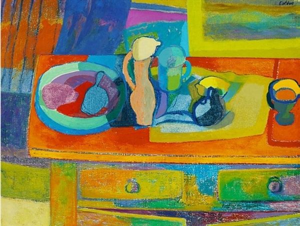 Curator: Rosemarie Beck painted "Self Portrait" in 2000. What's your immediate take? Editor: Stark. Almost brutally honest, wouldn’t you say? The red jacket against the ambiguous, colourful city is very striking. There’s an unsettling contrast of interiority versus public sphere, artist versus world. Curator: I agree. The bold impasto technique is arresting, look how Beck uses layered strokes to build the scene, and the juxtaposition of planar forms adds to the painting’s angularity. The subjects, though realistic in form, are made abstract through colour. The colour is the emotive part. Editor: Definitely. It is very much expressionistic, echoing the tradition of subjective experience as seen through the artist’s inner state. This feels…complex, the way she places herself in the lineage of women and art, with her statue doubles. It asks, "What does it mean to be a woman creating in her space?" Is she commenting on objectification or reclaiming it? Curator: Notice too how the city just outside the studio is present, yet ambiguous: only vague, structural colour blocks exist in that space. By creating contrast in terms of visibility and proximity, Beck shows the power in an artist's chosen gaze. Editor: Her choice to paint herself with these almost ethereal, muse-like figures makes me think of legacy, almost ancestral artistic creation. This isn’t simply a self-portrait, it's a statement about identity and what it means to grapple with her own visibility. Curator: It seems to me the geometry also tells us something vital; planes give way to softer features. This shows us an idea of objective planes merging into emotional realities. Beck is an objective subject, with soft features; almost angelic in form, and very real in emotive colour. Editor: It is a bold work that blends history, identity, and subjective experience into a really visceral whole, wouldn’t you say? Curator: Yes, absolutely. A testament to the enduring power of form.