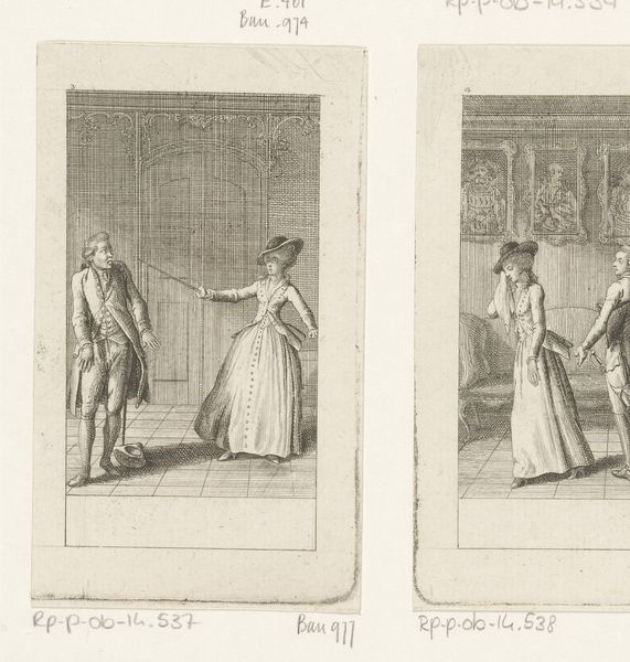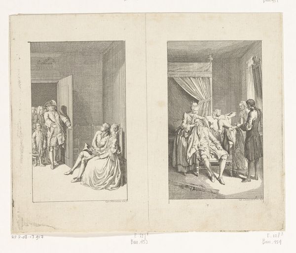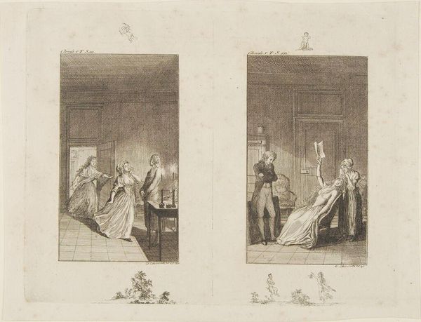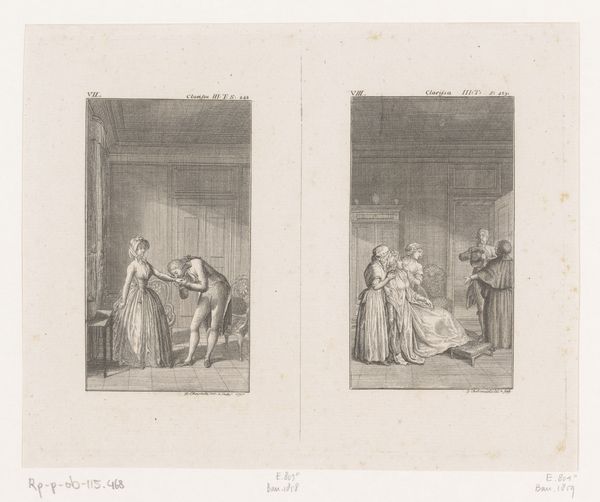 This is an illustration to Samuel Richardson's Clarissa, made by Daniel Nikolaus Chodowiecki, who was a master of the etching technique. The appeal of an etching lies in its fineness of line. To make one, you have to prepare a metal plate, usually copper or zinc, with a coating of wax. Then, you draw into that coating with a sharp needle, exposing the metal beneath. The whole plate is then immersed in acid, which bites into the exposed lines. After the plate is cleaned and inked, it can be printed onto paper. The image shows two scenes separated side by side, with intricate interior settings, architectural details, and costumed figures. Notice how this illustrative approach lends itself well to mass production. Etchings like these were very popular as illustrations in books, journals, and as individual prints, making art accessible to a wider audience. They democratized art, moving it away from unique paintings towards serial reproducibility.