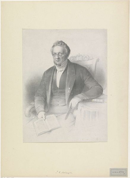 Editor: This is a pencil drawing titled "Portret van Abraham Johannes Couwenberg," created between 1818 and 1863 by Isaac Cornelis Elink Sterk. The subject is a man, finely dressed. It seems very typical of its time, quite formal. What strikes you about this portrait? Curator: The formality you observe speaks to the rise of the bourgeoisie and their aspirations for social standing during this period. Portraiture became a powerful tool for self-representation and constructing identity. Notice his hand gesture and clothing: how might they be signaling social status? Editor: It looks like a conscious pose, meant to convey confidence or authority perhaps? And the quality of clothing and the spectacles too speak of education. But why a pencil drawing instead of a painting? Curator: Excellent point! The choice of pencil reflects changing artistic values and the accessibility of art production. Lithography, a more reproductive technology, made images like these accessible to a wider public. Consider how this impacts the exclusivity traditionally associated with painted portraits. It becomes almost democratic, in a way. Editor: So it’s not just about aesthetics, but also about who gets to participate in art, both as a subject and audience? It is a subtle power dynamic isn't it? Curator: Precisely. The rise of a merchant class wanting to mimic the styles of aristocrats also put a pressure on artistic representation. Now they have disposable incomes to collect and the art institution has a pressure to deliver works. That's why its presence at the Rijksmuseum matters – what does this signify when displayed in such an institution? Editor: I hadn’t thought about it that way! Seeing it here gives it validity and permanence that it might not have had. Thanks! Curator: Indeed. Considering the institutional framing helps us understand the layers of meaning embedded in what appears, on the surface, as simply a man's portrait.