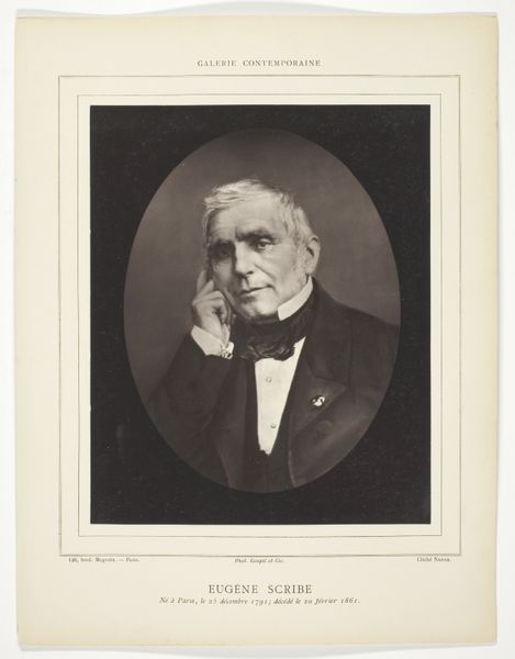 This photographic print of Jules Michelet was created by Goupil & Cie. sometime between 1850 and 1884. Goupil & Cie, based in France, was an important art dealership that significantly shaped the art market during the 19th century. The photograph captures Michelet, a prominent historian known for his romantic and nationalistic interpretations of French history. Photography in this era was increasingly being used for documentation and the construction of public image. This portrait can be seen as an attempt to solidify Michelet's legacy. The framing and the formal pose reflect the cultural values of the time, emphasizing respectability and intellect. Knowing about the complex political and social contexts of 19th-century France, including the rise of nationalism, helps us understand the image's intended message. Historians consult archives, letters, and other period documents to gain insights into the creation and reception of such images, revealing how art interacts with society.