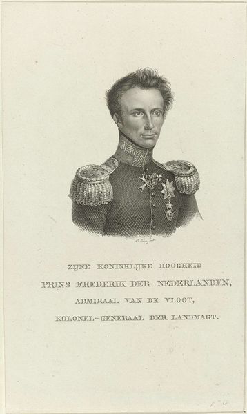 Editor: This is "Portret van Frederik, prins der Nederlanden," a print from sometime between 1827 and 1871, currently at the Rijksmuseum. He looks so formal in his military attire. I'm struck by the way the light emphasizes his face and those elaborate shoulder decorations. What can you tell me about its context? Curator: This print exemplifies how power was visualized and disseminated in the 19th century. Its creation and distribution are deeply intertwined with the rise of nationalism and the construction of a unified Dutch identity following the Napoleonic era. Editor: So, this wasn’t just about showing what the Prince looked like. Curator: Exactly. Think about it – this print would have been reproduced and circulated widely. How might that have served the ruling family, particularly in an era grappling with ideas of nationhood and popular sovereignty? Editor: It's a carefully crafted image designed to project authority and legitimacy. The symbols, the uniform… they all contribute to this image of a strong, stable leader. Was romanticism, which the artwork metadata mentioned, always associated with leaders? Curator: Romanticism wasn't always inherently tied to leadership, but it could be instrumentalized to construct powerful national narratives and associate leaders with particular values – think of the picturesque landscape behind him. Doesn't that invoke a sense of connection to the land, to the Dutch nation? Editor: It does. I guess I hadn’t really considered how prints like these operated as a kind of… propaganda, almost. Curator: In a way, yes. It reveals how images become active agents in shaping public opinion and solidifying social hierarchies. It’s a good reminder that what we see in a museum is often the result of complex political and social forces. Editor: This has made me rethink the role of portraiture in general. It's not just about capturing a likeness, but about actively constructing an image, a message. Curator: Precisely. By understanding the historical context and the social functions of images like this, we can gain a much deeper understanding of the past and its relationship to our present.