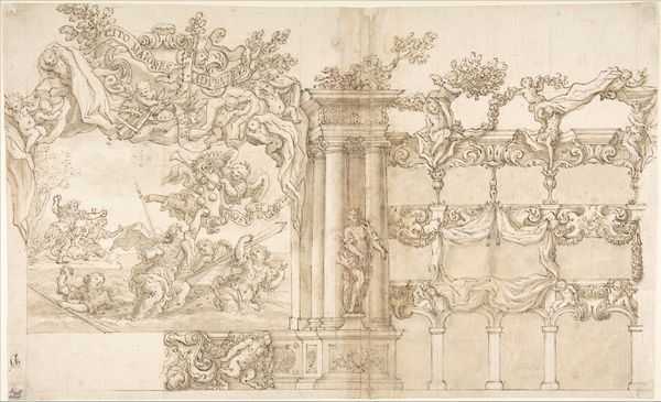 This Frieze was made by an anonymous artist, using pen and brown ink with green wash. The drawing's material is essential to understanding its purpose, and meaning. Pen and ink allowed for precise detailing and controlled lines. The artist used this to delineate complex patterns, from the intricate scrollwork to the ornate garlands of flowers. The green wash adds depth and dimension to the figures within the oval frame, making them stand out against the neutral background. However, the choice of a relatively inexpensive material like ink and the linear form of the artwork, suggests a focus on design and reproduction, rather than the unique expression often associated with fine art. This drawing was likely intended as a preliminary sketch or model for a larger decorative project, such as a relief sculpture or fresco. The emphasis is on functionality and scalability, demonstrating the crucial role of drawing in the development of larger artworks. By considering the materials and the processes employed in its creation, we can appreciate the Frieze not just as a finished product but as a testament to the collaborative and often anonymous labor that lies behind many grand artistic achievements.