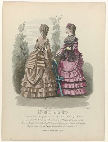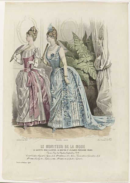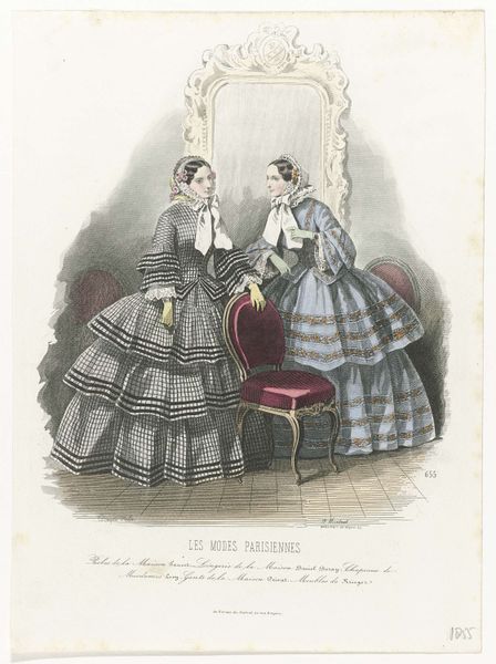 Jean-Baptiste Réville created this print titled 'Le Moniteur de la Mode' in June 1854. Produced during a time of significant social change and industrial advancement in France, fashion became increasingly commercialized and accessible. The image presents two women adorned in elaborate dresses, showcasing the ideal feminine silhouette of the mid-19th century. These elaborate dresses and the pursuit of fashion highlights the constraints placed on women of the era, where appearance and social status were closely linked to their worth. It’s hard to imagine how the women wearing them could engage in the increasingly mechanized production of the time. Fashion publications like ‘Le Moniteur de la Mode’ played a crucial role in shaping desires and dictating trends, but they also reflect the limited roles available to women in society. These images acted as both aspiration and confinement, embodying the complex and often contradictory experiences of women navigating a rapidly changing world.
