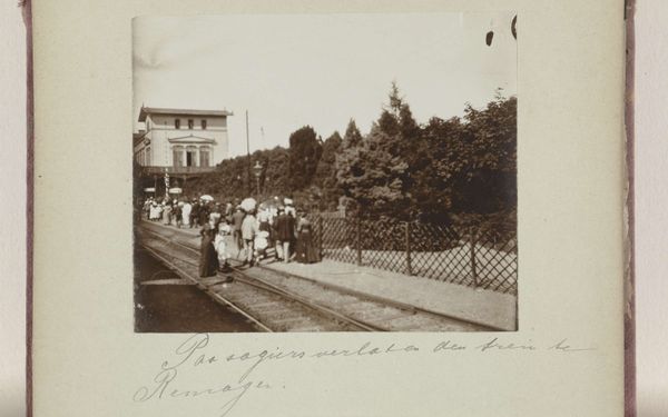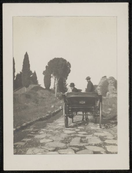 Editor: We're looking at "At Yokohama," a gelatin-silver print photograph taken in 1908 by Geldolph Adriaan Kessler, housed at the Rijksmuseum. The composition is striking; it depicts figures walking along a path in Yokohama. It feels almost staged, despite its candid appearance. What stands out to you? Curator: The formal elements here are particularly compelling. Note the contrast between the dark attire of the Western figures and the lighter kimonos. Consider the horizon line, dissecting the photograph; how does that impact our perception of depth? Editor: I see what you mean about the contrasting attire. It subtly hints at a cultural interplay. What does the architecture and the way the landscape’s represented convey? Curator: Examine the use of light and shadow and how that delineates forms, thus rendering spatial relations and a pictorial atmosphere; consider that the buildings on the small hilltop punctuate the skyline; and consider, too, the photograph's textures which reveal information, imparting specific meaning through details. The photograph seems more interested in spatial arrangements. What overall system is it trying to generate, do you think? Editor: Maybe a kind of ordered vision, placing everything – people, buildings, sky - in its proper place in a modernizing world. Curator: Precisely. And do you see how the photographer emphasizes formal, compositional choices to give expression to that sensation? That helps us examine what we can understand about it as an image independent of its subject. Editor: Right, focusing on elements like composition and contrast. I never looked at it that way before! Thanks. Curator: My pleasure. It is amazing how the construction reveals new aspects to us even after the first view.