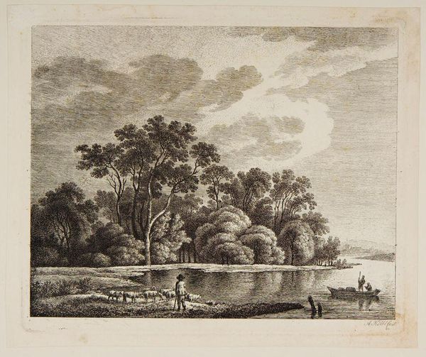 Curator: John Cousen’s "Woodland View," housed here at the Harvard Art Museums, is rich with visual codes. Editor: It definitely has a tranquil, storybook quality, almost like a scene from a classical pastoral poem. The light feels both serene and directional. Curator: Look at the arrangement of the trees. They frame the dwelling, creating a sense of sanctuary, a safe haven within the wilder spaces. Editor: The lines are so meticulously engraved—you can almost feel the process of mark-making, the labor embedded in each detail of the trees and the water's reflections. Curator: Exactly! The figures journeying through the landscape, the cottage nestled in the background, evoke a longing for simpler times, for a life lived in harmony with nature. Editor: I'm struck by how the engraving transforms a natural scene into something so carefully constructed, almost manufactured. Curator: It's fascinating to see how nature, and our relationship with it, is mediated through symbol and craft. Editor: It really does highlight the artistry behind what seems, at first glance, to be a straightforward representation of nature.
