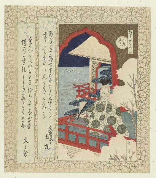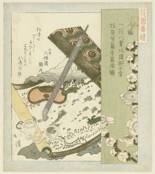 This print, titled "Het nog niet geopende rood," was created by Totoya Hokkei in Japan between 1810 and 1830, using woodblock printing techniques. Hokkei lived during the Edo period, a time marked by relative peace and flourishing arts, yet rigid social hierarchies. The print invites us into the intimate space of a scholar’s room, indicated by the low table, cushions and perhaps most poignantly, a distinctive black hat. Adjacent to this interior scene, a vertical panel displays delicate plum blossoms. The visual juxtaposition creates a sense of both nearness and distance, echoing the complex interplay between the private intellectual world and the broader natural and social environment. The calligraphy adds another layer, with poetic verses alluding to themes of beauty and transience, drawing us deeper into the emotional landscape of the scene. By merging interior and exterior spaces, Hokkei hints at the interconnectedness of personal reflection and the world outside, allowing us to reflect on how our identities are shaped by both.