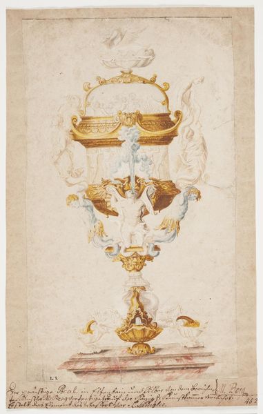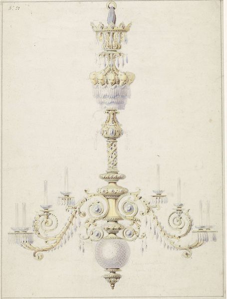 Editor: Here we have John Yenn's "Design for a Sconce with a Mirror," created sometime between 1770 and 1821. It's a watercolor and print piece. I’m struck by its formal elegance, almost cold in its precise symmetry. What are your thoughts on this decorative art piece? Curator: This design embodies Neoclassicism, a movement that harked back to the perceived purity of classical art, architecture and thought, doesn’t it? I'd like you to think about the sociopolitical context, then: beyond surface aesthetics, how did these idealized forms and the Enlightenment values they mirrored shape class structures and reinforce existing power dynamics? Editor: So, this isn't just about pretty designs. The rigid symmetry... was it maybe reflecting a desire for social order and control? Curator: Exactly. Consider, too, who could afford such elaborate designs. The mirror implies self-reflection, but whose reflection was valued and amplified? What ideologies were being literally *reflected* back at the wealthy patrons? Also, how might gender be implicated in this image? Editor: Hmm, interesting. Maybe it also showcases a particular construction of femininity—beauty as a reflection of societal ideals? Curator: Precisely. What seems simply decorative can be seen as reinforcing specific norms about women and how they should perform. Does this make you reconsider your initial assessment? Editor: Absolutely! It is not just elegant. It's loaded with ideology. I hadn't really thought about how seemingly innocuous design choices can carry such weight. Curator: Yes. This deep dive allows us to question assumptions about beauty, utility, and their relationship to broader historical and social realities, don’t you think? Editor: Yes, for sure! I will definitely see these designs differently from now on.