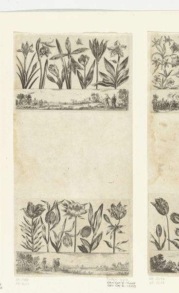 Editor: Here we have Nicolas Cochin's "Horizontal Panel with a Row of Flowers Above a Frieze with Figures in a Landscape, from Livre Nouveau de Fleurs Tres-Util," created in 1645 using etching and engraving. The detail is really captivating. It almost feels like two separate worlds stacked on top of each other. What do you see in this piece? Curator: I see a direct connection between the meticulous craft of printmaking and the value placed on natural resources during this period. Etching and engraving allowed for the mass production of these floral images. It speaks to the commodification of nature and how new technologies played a role in visualizing and disseminating images of the natural world. Consider the social context: elaborate gardens were status symbols. These prints, circulated widely, served as accessible templates, influencing gardens and textiles. The labor and materials of making a print mirrors agricultural labour too; this is very revealing about that century. Editor: So you're saying the act of creating these prints was as important, or perhaps more so, than the image itself? I'm used to looking at prints and engravings as beautiful, unique images - never how the economics play into the context. Curator: Exactly. These prints democratized access to botanical knowledge and design. What happens when we treat these not as precious works, but examples of material culture that can reflect broader patterns of making and selling? Who had access to gardens and landscapes in that era? And how did printmaking change access to the visual culture of idealized nature? Editor: That makes me look at it very differently. I guess I was stuck on the artistic merit and missing the broader picture – all this labour intensive technique for mass consumption, impacting design trends! It really shows how intertwined art, craft, and the economy were even back then. Thanks for expanding my perspective. Curator: And thank you for reminding me of the aesthetic appeal and continuing wonder of these historical depictions of flowers. I am very grateful that we have been able to analyze this together.