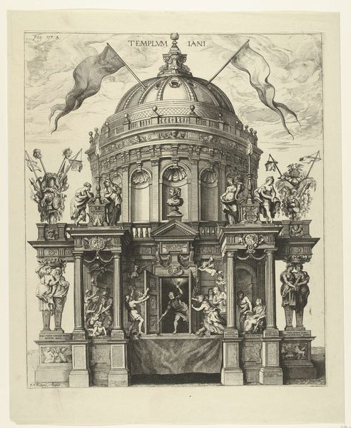 Curator: Looking at "Fountain of the Four Continents", a print crafted between 1672 and 1686 by Louis de Châtillon, now residing at the Rijksmuseum. Editor: It evokes such a potent sense of power, almost a staged drama rendered with incredibly fine lines. Is it an architectural drawing, perhaps? Curator: Indeed, it is a meticulously detailed rendering of a planned baroque fountain. Note the four figures, representing each continent known at the time, adorned with their respective attributes. These figures symbolize a very specific worldview. Editor: Yes, and the symbolism leaps out. Europe, I imagine, is the figure adorned with... what is that? A helmet and a shield? There’s a subtle, perhaps unintentional, implication of dominance encoded within the composition, wouldn't you agree? The piece, beautiful though it is, seems rife with colonial overtones. Curator: Precisely! The arrangement certainly speaks volumes about the era’s understanding of global power dynamics. Notice how the water flows, originating seemingly from the figures and cascading down, giving life and prosperity, visually tying into European opulence. There is much loaded symbolism. The fountain’s water, an age-old signifier of life, abundance, and purification is shown being "gifted" from those continental figures, thus cementing the "natural" order of dominance. Editor: Water as a colonial gift! An interesting argument about imbuing supposed purity and civilized culture. We're viewing this print today in a radically different social and political context, where we examine and critique such historical expressions of power. How do we engage with this piece ethically? Is there an implied narrative about "civilizing" other continents through European influence, even violence? Curator: Well, the enduring power of symbols rests in their ability to retain historical meaning while accumulating new ones. By studying this print, we witness a confluence of artistic mastery and complex historical messaging, sparking, as you pointed out, much-needed dialogue. Editor: Yes. Engaging with art, especially historical art, critically allows us to understand where we've come from to shape where we're headed. This fountain is certainly brimming with dialogue.
