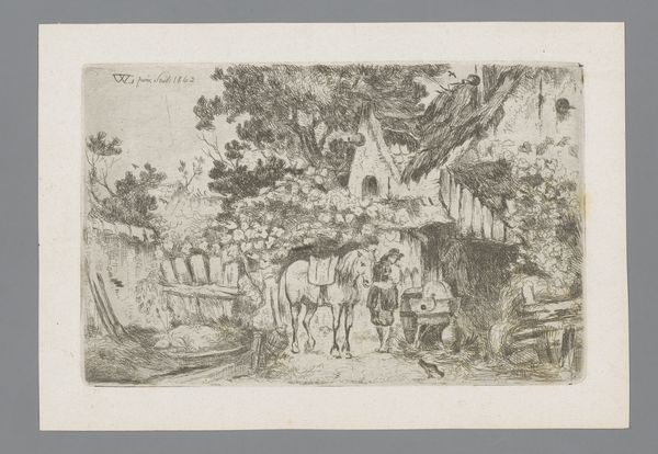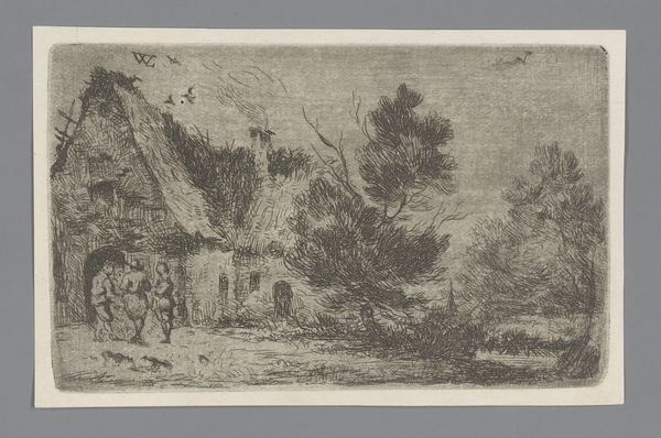 Willem Linnig the Second created this landscape with etching in 1862. Linnig situates us in a rural setting, right outside a farmhouse with four figures in front. Linnig lived during a time of significant social change, particularly regarding class structures and rural life. As industrialization progressed, the traditional agrarian lifestyle was increasingly idealized by artists, writers and city dwellers alike. The four figures outside of the farmhouse become a focal point. They appear to be engaged in a casual gathering which suggests themes of community and interpersonal relationships, while raising questions about the role of rural communities in shaping social identity. Linnig avoids idealizing the rural environment or the laboring class. He presents a straightforward view of country life that acknowledges their presence without romanticizing their condition. This image offers a moment to reflect on our connections to the land and each other.