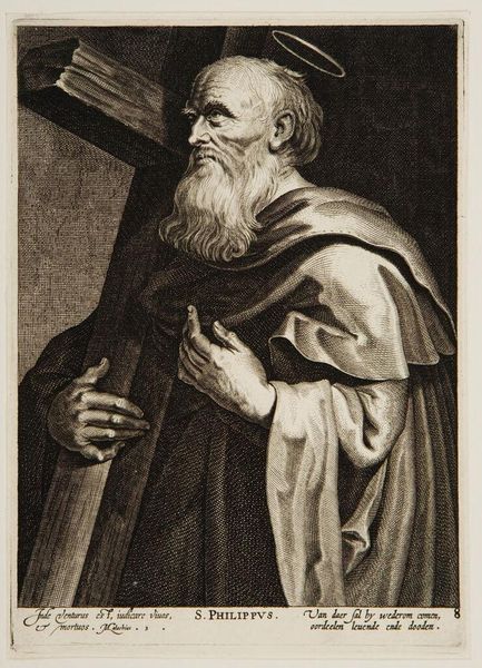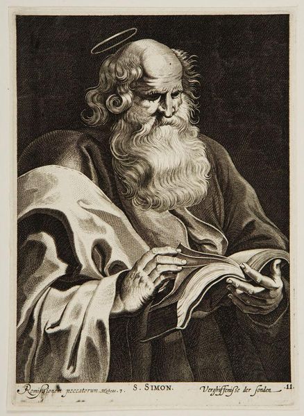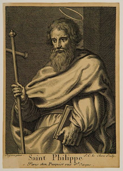 Editor: Here we have Nicolas Ryckemans' Saint Paul. It's an intriguing portrait, and what strikes me is the contrast between the saint’s halo and the prominent sword. What do you see in the composition? Curator: The arrangement certainly creates a visual tension. The linear precision of the sword, its hilt a grotesque face, is juxtaposed with the soft curves defining Saint Paul's face and the drapery. Consider the symbolic weight of each element. Editor: So, the hard versus the soft, the halo versus the sword... it's all about the formal relationships? Curator: Precisely. The artist uses these opposing forms to engage the viewer, prompting questions about the nature of faith and power. What meaning do you derive? Editor: I see now, it's not just a portrait, it's a study in contrasts meant to provoke thought! Curator: Indeed. The composition invites us to contemplate the complexities inherent within such a figure.