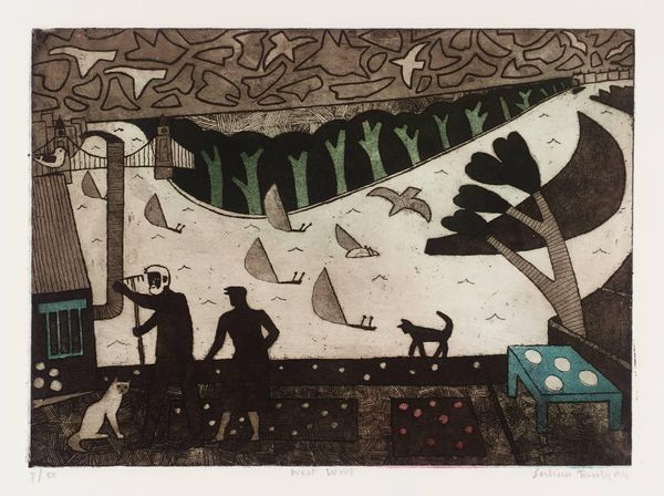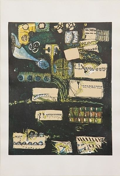 Editor: This is Sir Sidney Nolan’s "The Defence of Aaron Sherritt," from an unknown date, held at the Tate. It strikes me as strangely claustrophobic, with those figures almost pressed into the frame. What's your reading of it? Curator: Nolan often explored Australian identity through the lens of its infamous figures. How does this work engage with themes of betrayal, protection, and the complexities of law and order within a colonial context? Consider the social dynamics at play. Editor: It feels like a stage set, with everyone playing a role, but trapped. Curator: Exactly. And how does that contribute to a broader understanding of power structures and individual agency within these historical narratives? Let's think about who is really being defended here. Editor: This makes me reconsider the gaze in the painting. Thanks for your insights. Curator: And thank you for prompting a fresh look at Nolan's exploration of Australian narratives.
