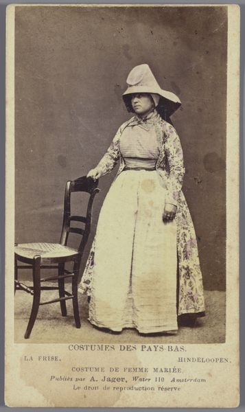 Curator: Here we have "Le chapeau à plumes," or "The Feathered Hat," a photographic portrait from the 1860s created by Pierre-Louis Pierson. It's an albumen print, now residing at the Metropolitan Museum of Art. Editor: It’s astonishing, the scale of that gown almost consumes the image. You're drawn to the opulence of it. Is that real lace trimming the edges? Curator: Absolutely. In terms of symbols, feathers often represent status, wealth, and a connection to the divine, especially in this period. A photograph like this projects aspiration and cultivated taste. Note how the stark background directs attention solely toward the figure and her garment. Editor: Right, but the image isn't solely about projecting status, is it? Consider the time and labor involved in such elaborate textiles. That dress would require immense skill and hours from seamstresses. The materiality speaks volumes about industrial practices and class structure. Curator: True. There is also a nod to Romanticism. We observe this through a sentimental vision and idealized beauty – it pulls the viewer into an emotional relationship. Editor: What also strikes me is the photographer’s technique; albumen prints involve a lengthy, demanding process. The preparation of the glass plate, the precise timing—a collaboration, really, between sitter and maker. The photographic technology is itself very physical. Curator: Certainly. The act of creating such an image solidifies its impact, amplifying its message far beyond mere physical appearances. Each element conveys deep meaning. Editor: Indeed, examining the physical processes of art allows a broader scope of labor, time, and material conditions which otherwise get veiled by art history and theory. Curator: A rich encounter, both visually and conceptually. Editor: Agreed, layers of meaning emerge as we look beyond the surface sheen.