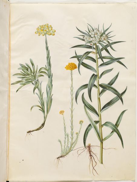 Curator: Here we have "Spiraea salicifolia; Catananche caerulea" a botanical drawing rendered sometime between 1649 and 1659 by Hans Simon Holtzbecker, housed here at the SMK, the National Gallery of Denmark. The work is on paper using watercolor and gouache techniques. Editor: My first thought? Elegant restraint. It's almost a scientific record, yet it breathes with such delicacy. You feel like you're peering into a secret garden, a botanist's treasured observation. Curator: Botanical art, particularly during Holtzbecker's time, served a very specific purpose. Beyond mere aesthetics, these drawings documented flora for medicinal and scientific study. Each detail carries the weight of accuracy, of symbolic representation. Editor: Absolutely. I'm drawn to how he captures light on the leaves – there's this gentle glow. The plants have their own subtle personalities! It isn't cold observation at all. There’s almost a spiritual feeling radiating off them. Does that sound odd? Curator: Not at all. Color plays a significant role in that perception, especially regarding memory. Holtzbecker's choices for these flowers activate memories – blue for faithfulness, white for purity…these are motifs as old as art itself. The pale background contrasts beautifully with the vibrant green and delicate floral hues, evoking associations with idealized notions of nature. Editor: And each tiny vein meticulously rendered! That blend of accuracy and feeling... it speaks to how connected humans were to nature, what close observers they were. Now, we barely notice anything blooming on the sidewalk, if we even *walk* anywhere anymore. Curator: Precisely! It's a reminder of a world where understanding nature was not just an intellectual pursuit but a matter of daily survival. Also, Holtzbecker doesn't shy away from including imperfections – a slightly browned leaf, a drooping flower. Editor: Adds a lovely authenticity, doesn’t it? Less an idealized vision, more an honest portrait. It grounds the image, prevents it from floating away into pure romanticism. So, the painting really captures fleeting beauty rather than a permanent symbol? Curator: I think that tension – between symbolic representation and observed reality – is exactly what makes it so compelling after all these years. Editor: I concur completely! It's an evocative reminder of a slower time, and a deeper way of seeing. Thank you for revealing so much.