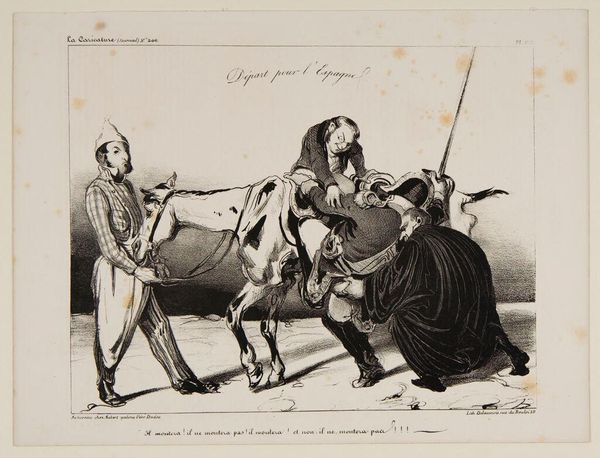 Curator: Here we have Honoré Daumier's lithograph, "The Prince's Mare and the Princesses' Dog." Editor: It's wonderfully absurd. The grotesque mare-woman immediately seizes attention. Curator: Daumier, born in 1808, used caricature to critique 19th-century French society, particularly its aristocracy. Note the way he exaggerates physical features. Editor: The lines themselves convey so much. See how they thicken to create depth and shadow, almost sculpting form out of ink. Curator: Exactly. The figures, particularly the hybrid mare-woman, become symbols of decadence and excess, reflective of the Bourbon monarchy. Editor: I agree. The drum and the dog are also carefully considered compositional elements that lead our eye through the lithograph. Curator: The print’s power lies in its historical commentary. Daumier exposed the flaws within the ruling class through accessible imagery. Editor: Indeed, it's a testament to how form and content work in concert. Curator: A potent visual statement that continues to resonate across time. Editor: A biting satire rendered with remarkable artistic skill.
