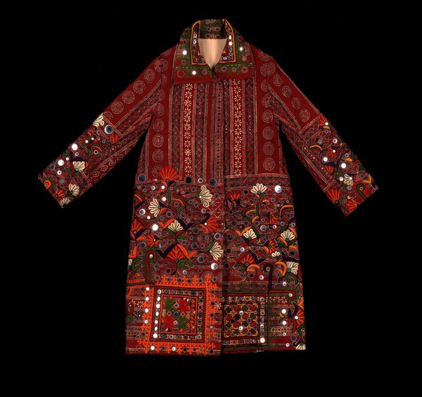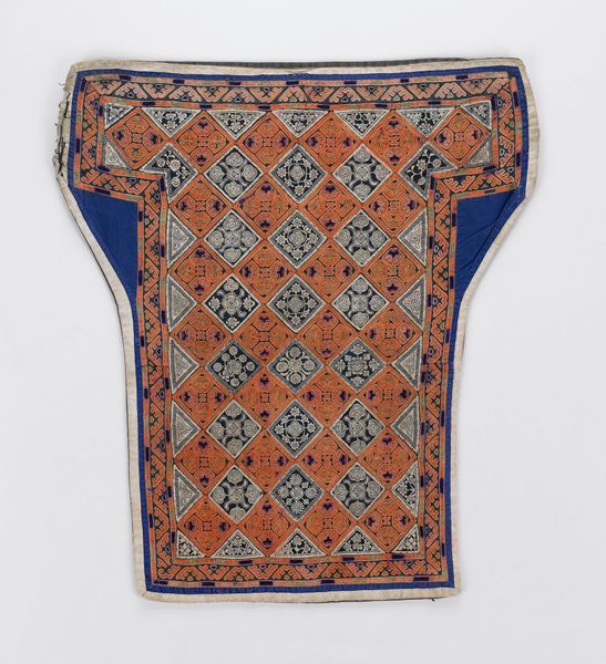 Curator: The jacket before us, crafted from cotton, offers a glimpse into the textile artistry of the Gejia Miao people of China, sometime around the 20th century. Editor: I’m immediately struck by the stark contrast and geometric precision. There's almost a hypnotic quality to the repeated circular motifs. It makes me wonder about its context. Curator: Context is indeed key. This isn't merely clothing; it's a carrier of cultural identity. The Miao are known for their incredibly complex weaving, embroidery, and batik techniques. Clothing holds deep significance in communicating social status, beliefs, and history. We might think about it today in relationship to contemporary designers whose work also holds a clear thesis. Editor: Right. And it would be fascinating to examine who had access to create such elaborate pieces and for what specific events. Thinking about how those factors influenced the design is also really interesting to consider. It seems this was not casual wear. The intense labor suggests specific, maybe ritual, occasions. How would it function in the wearer's social performance? Curator: Exactly! The creation of textiles like this were, and sometimes still are, often community events. Consider the labour, resources, and knowledge intertwined within a single piece. These jackets become archives embodying individual skill and a collective story. The circles and geometric shapes speak to Miao cosmology and worldview, a tangible representation of their lived experience and philosophical understandings. Editor: Looking at it now with that understanding gives it an even greater weight. These aren’t simply patterns, but stories literally woven in, which moves our consideration to where this piece is placed today, in the collection of the Minneapolis Institute of Art. Does its display reflect those interwoven stories, or does it inadvertently flatten its significance by extracting it from the world that created it? Curator: A crucial point. Institutions have a responsibility to ensure that displaying cultural objects doesn’t further erase the voices and experiences that created them. Exhibitions, when well-researched, become a nexus for bridging historical context and contemporary conversations about cultural heritage and identity. It requires museums to really ask themselves: Who is this exhibit for and who is included in telling this jacket's story? Editor: Indeed. A deeper examination calls on us to acknowledge the piece's multiple layers and resist reducing it to pure aesthetics or exoticised presentation. Curator: Right. Hopefully this conversation illuminates some of the multiple ways one garment invites inquiries beyond surface level.