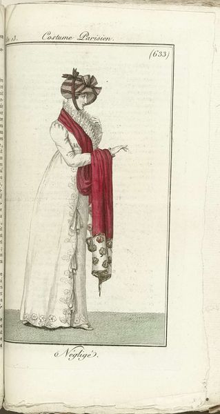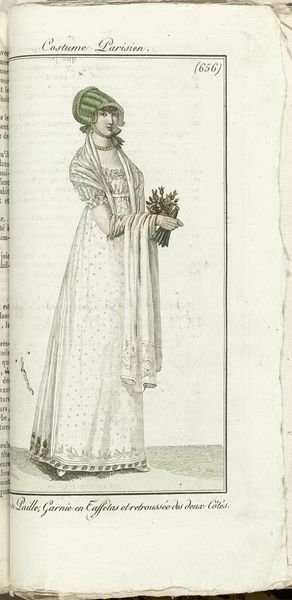 Editor: We’re looking at “Journal des Dames et des Modes, Costume Parisien, 1805, An 13 (667) Costume Paré,” an engraving by Horace Vernet from 1805. It features a woman in a very high-waisted dress, typical of the time. It’s a rather formal and somewhat constrained image. What are your thoughts on it? Curator: I see this print as more than just a fashion plate. It's a snapshot of the shifting social and political landscape post-French Revolution. Consider the emphasis on elegance and refinement. How might that relate to anxieties about social hierarchies in flux? What does this particular representation of femininity convey about the role of women in that era? Editor: That’s interesting! I hadn't really considered the post-Revolution context. So, you’re suggesting it’s less about fashion and more about… societal pressures? Curator: Exactly! The romanticism, on one level, might appear as simple sentimentality. But if we dig deeper, we find this image speaks volumes about the aspirations and anxieties of its time. Who had access to these images, and what message did it convey? Consider how even seemingly innocuous depictions of dress could be understood as statements of political alignment or social aspiration. Editor: I see your point. The "romanticism" aspect may downplay more subtle messages that are present within the picture. What implications might there be in a new mode of dress for gender or class identity at the time? Curator: Precisely. That’s the kind of critical inquiry we need to bring to even seemingly simple artworks like this. Looking beyond face value and connecting art to broader socio-political conversations lets us consider the deeper history. Editor: That gives me a completely new perspective! I will definitely look at fashion prints differently now, keeping in mind their cultural background.