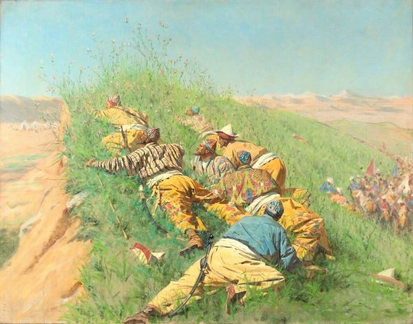 John Singer Sargent created this poignant oil on canvas, titled "Gassed," in the aftermath of World War I. The painting depicts a scene of wounded soldiers, victims of a mustard gas attack, being led away from the battlefield. Sargent, an American artist, often portrayed upper-class society. His choice to depict the horrors of war reflects a shift in his focus, perhaps influenced by the war’s impact on society. The soldiers, blinded and vulnerable, represent the devastating consequences of modern warfare, challenging traditional heroic narratives of combat. Their linked posture speaks to the reliance on each other in a world that has otherwise failed them. "Gassed" captures the physical and emotional trauma experienced by soldiers during the Great War, inviting viewers to confront the realities of war beyond the battlefield.