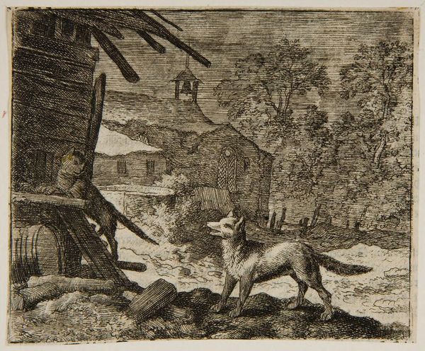Curator: Let's look at this print, "December," by Étienne Delaune, currently held at the Harvard Art Museums. What strikes you first? Editor: The visceral quality! Look at the raw, immediate depiction of labor. The etching technique emphasizes the coarse textures and the grit of this agrarian scene. Curator: Observe how the composition directs the eye through careful arrangement of forms, leading from the fire to the central butchering scene, and up to that rooster-like figure in the sky. Consider its symbolic import. Editor: I'm drawn to the active processing of the animal, the directness of the actions. It grounds the image in the everyday struggles of life and sustenance, the social realities of the time. Curator: True, but it’s equally important to consider the idealized rendering of these figures, their classical poses adding a layer of artifice to the scene. Delaune's meticulous technique elevates a simple subject. Editor: But that elevation comes from the labor itself, the skill in processing materials for survival. Seeing it rendered so intimately connects us to those material processes. Curator: A compelling point. It reveals how even within seemingly simple depictions, a complex interplay of representation and lived experience unfolds.