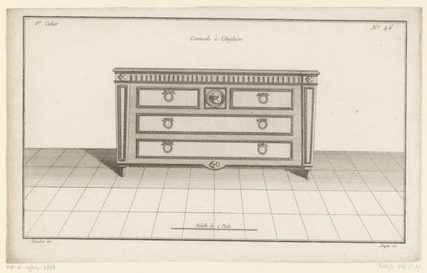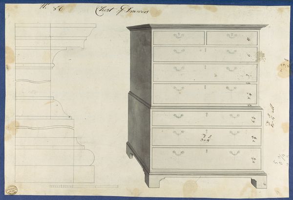 Curator: What immediately strikes me about this work is its rather unassuming elegance. It feels very still and reserved. Editor: Agreed. We’re looking at a pencil drawing by Bernard Gussow, created sometime between 1935 and 1942, titled "Desk." Curator: Desk as in, the place for labor, for writing? The rigidity and geometric style almost seems to resist the more fluid associations with the activity of writing. I find myself thinking about power structures inherent in those who possess such desks, especially in this historical period. Editor: It’s an interesting point. Consider the historical context – the late 1930s and early 40s. The linearity and precision can also reflect the increasing rationalization of labor happening in this era. We have two views presented, one of the desk straight-on, and another in profile. Curator: The multiple cubbyholes, each potentially holding some crucial document or personal artifact, feels almost like an architectural rendering of memory and record-keeping. How were desks like these seen as status objects at the time? Editor: Certainly as emblems of authority, industry, and the efficient management of information. The materials involved – presumably valuable woods – signified economic standing. One also wonders about who had access, especially women during this period? What forms of knowledge production were limited to these spaces? Curator: It's like a miniature bureaucracy captured in lines. Perhaps that central locked door within the upper section further restricts who has ultimate control, who dictates what should and shouldn't be made public. This drawing of a desk raises critical questions about space, access, and the gendered politics of intellectual and administrative labor. Editor: Indeed, viewing this "Desk," we see more than mere furniture; we uncover stories of influence, and societal frameworks woven within the grain. I agree with you, that while simple on the surface, the Gussow drawing speaks volumes about the politics and social dynamics ingrained within art itself. Curator: So, the next time we see an object like this, perhaps we will also reflect upon who wields such desks, the labor happening at such places and also consider those often kept outside such enclosures. Editor: I appreciate your perspective. Thanks.