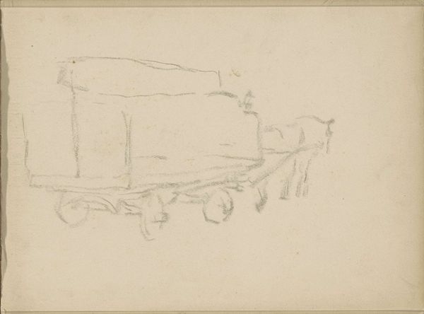 Editor: This drawing, "Boerenkar naar links," by Georges Michel, probably created sometime between 1773 and 1843, offers a peek at what seems to be a horse-drawn cart. The sketch is light, almost ephemeral, with the forms softly emerging from the paper. What do you see in the way Michel approached composition? Curator: The intrigue of this drawing lies precisely in that seeming incompleteness. Michel, from a Formalist viewpoint, uses line not just to delineate form but to suggest movement and temporality. Notice how the repeated lines give dynamism. Editor: So the form itself creates the narrative? Curator: Precisely. Look at the materiality: the deliberate use of pencil on paper is integral to this work. The gray creates an open, airy feeling within the piece. The precision on the closest wheel juxtaposes to the barely defined carriage driver. What effects might this intentional ambiguity create? Editor: Perhaps it encourages the viewer to complete the scene in their mind, adding their own impressions of movement or mood. The lines fade into the background, almost dreamlike. Curator: Indeed. And it's through these formal choices—line, composition, the texture of the medium—that Michel achieves a profound and evocative image, moving beyond mere representation. Editor: I hadn’t considered how the incompleteness contributes so much to the artwork. I see how much can be interpreted simply by examining formal choices! Curator: Understanding the artwork's composition and visual language definitely enables an enriched engagement with it.