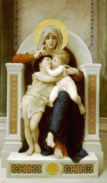 William Bouguereau painted "Le Sommeil" in 1864, and it draws us into a serene, intimate scene rendered with striking clarity. Observe the soft transitions of light across the figures and the detailed textures of skin and fabric, creating a palpable sense of presence. Bouguereau masterfully employs a triangular composition, with the mother as the apex and the children forming the base. This classic structure lends the painting a sense of stability, drawing the eye upward to the mother's face. Her gesture—finger to lips—silences not just the child beside her but perhaps also invites the viewer into a shared moment of hushed reverence for the beauty of maternal care and slumber. Note how the cool blues and whites contrast with the warm tones of the children’s skin, enhancing the sense of depth and realism. Bouguereau's academic technique, while seemingly straightforward, achieves a complex interplay between surface and depth. The image functions as a social commentary on idealized domesticity, echoing broader cultural values. Yet the enduring appeal of "Le Sommeil" lies in its formal elements, which, like the quiet moment it captures, continue to resonate across time.
