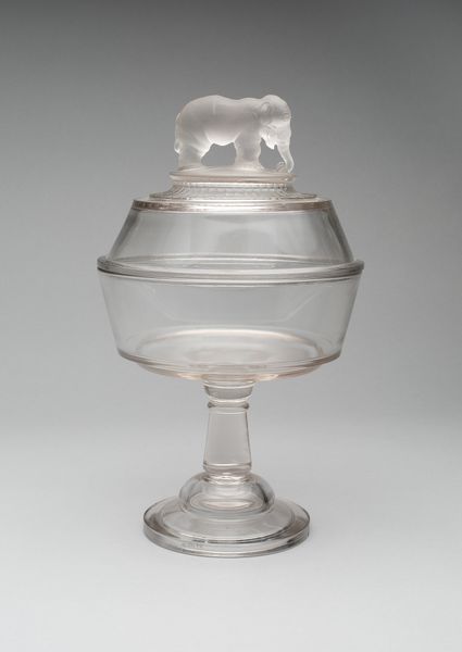 This covered dish was produced by the Canton Glass Company, which operated in Marion, Indiana between 1879 and 1899. The object is made from pressed glass, a technique which allowed manufacturers to produce vast quantities of glassware at relatively low cost. Notice how the glass is formed into a variety of textures: vertical ribs around the body, stylized leaves at the base of the handles, and of course the elephant on top, its surface delicately frosted. All of this was achieved not by hand, but through the use of molds into which molten glass was forced. Looking at an object like this, you can really see how the rise of American industry transformed the landscape of design. Pressing was a far cry from the rarefied craft of glassblowing. But it allowed for the production of affordable objects like this one, bringing new forms and textures into everyday life. Examining how it was manufactured helps us understand the social and economic context of its creation. It blurs the lines between factory production and design.