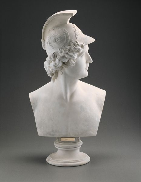 This is a marble bust of Félicité Sophie de Lannion, Duchesse de La Rochefoucauld, at the Age of 29 Years, crafted by Jean-Baptiste Lemoyne the Younger. The sculpture immediately strikes us with its smooth texture and balanced asymmetry. Notice how the artist masterfully employs line and volume to convey both the physical likeness and the noble status of the sitter. The curves of her coiffure and dress contrast with the straight lines of her neck and the base, creating a visual rhythm that draws the eye. Consider the use of marble as a material, its inherent coolness and association with classical antiquity. The texture captures the softness of skin and fabric, bringing a sense of life to the stone. Lemoyne uses these elements to create a visual language, a set of signs, which speak to power, beauty, and the enduring nature of art itself. The sculpture serves as a reminder that art is not merely representation; it is a complex interplay of form, material, and cultural meaning.