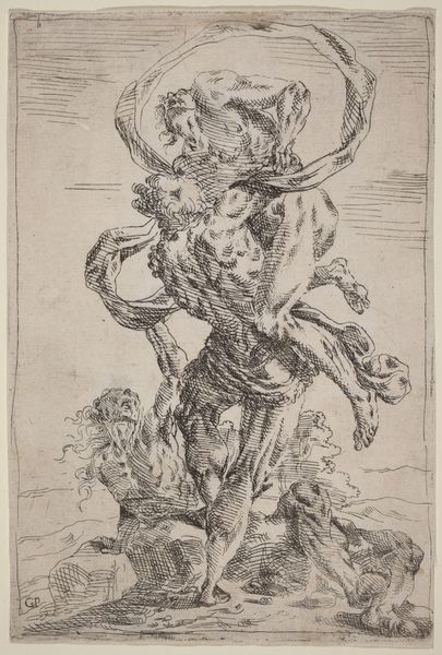 Curator: What strikes me immediately is the tonal range; the subtle gradations give such volume. Editor: Here we have "A Satyr Teased by Two Putti," a drawing by Jean-Honoré Fragonard, created circa 1774 to 1780, rendered in ink, charcoal, and pencil. The contrast feels rather…theatrical. Curator: It is. I think Fragonard is using line and wash to create movement, but he's also cleverly deploying his restricted palette, working through a range of earth tones to conjure a dreamlike scene. This period marks a shift where the availability and quality of drawing materials broadened to both professional artists and amateurs interested in sketching landscapes and natural scenes as a part of the Romantic Movement and “plein air” or outdoor sketching. Editor: True. And that velvety darkness around the satyr’s legs, set against the hazy cherubic figures, certainly guides the eye. Notice how the lightness emphasizes the delicate contours of the putti, playing off the darker, almost aggressive lines that define the satyr. It makes the satyr appear somewhat vulnerable. What do you read into the satyr's relationship to the putti, within the social context of this narrative? Curator: That's interesting; most see these pieces as playful—Fragonard often drew scenes of classical frolic. The teasing by putti—representations of innocent mischief—creates a scene that toes the line of the erotic, while maintaining the comedic. This dynamic hints at the consumption and entertainment for a refined 18th-century aristocratic audience—which reveals the decadence of the time. Editor: Agreed, and focusing on pure form again, look at the asymmetry within the work; the off-center positioning of the figures gives the piece an exciting imbalance. And what do you make of Fragonard’s choice of such earthy materials—the inks, the charcoal—do they evoke the primal nature of the satyr? Curator: Absolutely, the raw materials are crucial in underlining the primal themes, giving emphasis to the naturalistic and somewhat grotesque. Fragonard utilizes easily attainable materials. These would've also been readily accessible and not overly processed, reflecting an ethos centered on material and sensual realities. Editor: Indeed. It’s an image where material, composition, and social dynamics converge quite powerfully. Curator: Yes, the means of production mirror its cultural implications; how it’s made directly connects with why it's made and whom it's made for.