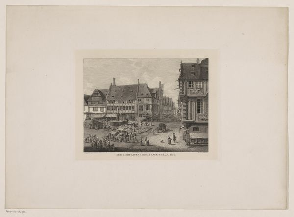 Editor: So, this is "Straatleven bij een gracht," or "Street Life on a Canal," by Hermanus Johannes van den Hout, created sometime between 1823 and 1869. It’s an ink print on paper. I’m struck by how serene it feels, even though it depicts a busy urban scene. What do you see in this piece? Curator: Beyond the surface serenity, I see a carefully constructed tableau that speaks to the socio-economic divisions of the time. The architecture, the positioning of figures – they all tell a story. Note the figures on the steps, seemingly observing the figures by the water. What kind of labor or social performance are these lower figures enacting that necessitates upper class surveillance? Editor: That's a perspective I hadn't considered. I was mostly focused on the technical skill involved in creating such detail with ink. Are you suggesting that the artist is making a commentary on social hierarchy? Curator: I think it's impossible to separate art from its historical context. Van den Hout lived during a period of significant social and political upheaval. The rise of industrialization was dramatically reshaping cityscapes, and older forms of governance began eroding due to calls for representative democracy. Look closer – the stark contrast between the detailed architecture of the buildings in the back and the more loosely drawn, almost anonymous, figures in the foreground. Is there an elision here? Editor: So, perhaps the seeming serenity is a facade, concealing underlying social tensions and hierarchies? That's fascinating. Curator: Precisely! The 'serenity' might actually be a strategic artistic choice, designed to subtly critique or even mask the complex realities of urban life. Always look deeper into the intersectional narratives embedded within seemingly simple depictions. Editor: That gives me a lot to think about. I'll definitely look at art differently now, considering its broader context. Curator: That's the beauty of art history – it's a lens through which we can understand and challenge our understanding of society.