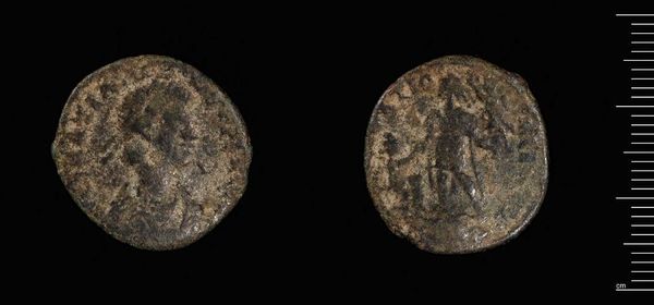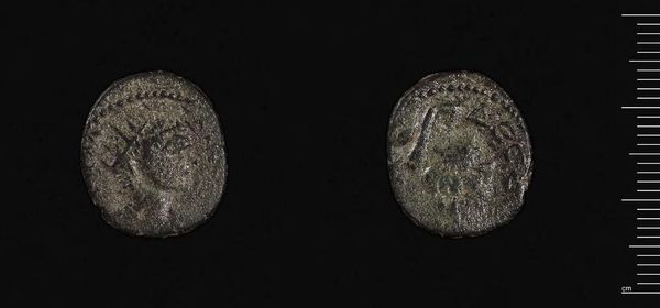 Editor: This is a coin of Cleopatra Thea and Antiochos VIII of Syria, Ptolemais. The material looks like metal. What stands out is how worn the coin is; how does that affect our reading of the piece? Curator: The wear, or patination, is significant. The obscuring of the fine details forces us to focus on the essential forms: the raised profiles, the circular shape itself. Consider the weight, the substance of the coin. What might that solidity have represented? Editor: Maybe stability? So, you’re saying the damage to the coin sort of highlights its basic elements and makes us think about what those mean? Curator: Precisely. The medium is intrinsic to the message. The coin's endurance asks us to consider what it communicated, and what value has survived. Editor: That makes me think about the power of symbols and materials to communicate, even when degraded. Thanks! Curator: My pleasure. A potent reminder of art’s ability to transcend time through form.
