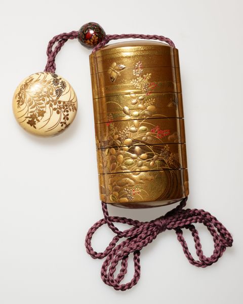 Editor: So this is an Inro, a Japanese case from the 19th century, attributed to Kakosai. It's made with a variety of materials – wood, ceramic, metal, gold… and depicts a narrative scene with figures and a landscape. The craftsmanship seems really meticulous. What strikes you most about it? Curator: Immediately, the diverse material construction of this piece catches my eye. We often separate "art" from "craft," but look at the labor embedded here. The carving, the metalwork, the ceramic elements… How does this blurring of material boundaries challenge our conventional understandings of artistic hierarchies? Editor: That’s interesting, I hadn’t considered that. I was more focused on the narrative – the god of longevity with the boy and tortoise. Curator: The narrative is undoubtedly important, but consider the social context of production. Who were the artisans who created this object? What was their status in society? Were they considered artists or craftsmen? The intricate detailing suggests specialized labor, dividing production among possibly multiple artisans. Editor: So you’re saying we should think about the makers, not just the images? Curator: Exactly. The value placed on different forms of making—high art versus decorative art—reflects specific historical power dynamics. In what ways does this miniature inro question distinctions between artistic disciplines and highlight consumption? Editor: I see your point. It's easy to appreciate the aesthetic qualities without considering the material reality behind its creation. Now, looking closer, I see how the combination of gold, wood, and ceramics elevates it from a simple object to something…more valuable. Curator: Precisely. By examining the materials and production, we move beyond simply appreciating its beauty and understand how labor, materiality, and consumption intersect within this miniature artwork. Editor: This has shifted my perception; I’m now seeing this Inro not only as an artwork, but also as evidence of production methods of its time.