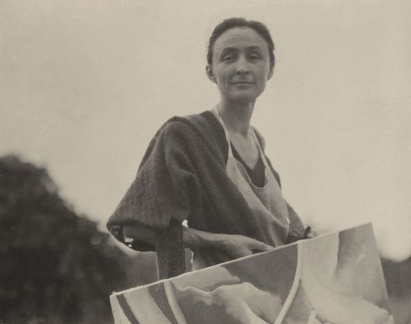 Editor: Alfred Stieglitz captured this gelatin-silver print, entitled "Georgia O'Keeffe," in 1927. I find the image striking, particularly the gaze of the subject and her intense, thoughtful mood. What symbolic layers do you see in this portrait? Curator: I see a layering of symbols tied to O'Keeffe's persona and her artistic explorations. Her direct, unwavering gaze can be seen as an assertion of her independent spirit and artistic vision. The box she holds… do you notice the shadows around the box she holds? Editor: Yes, it's small, almost like a treasure, nestled securely in her hands. It could represent secrets, creativity or inner thoughts? Curator: Precisely! Think of containers, boxes, or vessels as metaphors for interiority, a holding place for ideas, emotions, and potential. The dress pattern…what comes to mind? Editor: It looks botanical but stylized, almost like exploding seeds, conveying growth and life. Curator: Indeed, those stylized, natural forms relate directly to O'Keeffe's well-known artistic vocabulary. Stieglitz captured the essence of O'Keeffe's spirit, representing her as both a strong individual and an artist deeply connected to nature. The stark monochrome intensifies this, stripping away distractions to reveal core essences. It invites a dialogue about female agency and creativity in the early 20th century. Editor: It's incredible how Stieglitz uses photography to weave so much meaning into a single image! Curator: His photographs weren't merely records, but intimate interpretations of their subjects and their place in the cultural landscape. These elements are meant to speak to the relationship, the female spirit, and their creative journey. Editor: I never realized how the items in a portrait could be so important. It truly makes me think differently about portraiture in general.