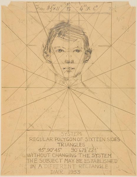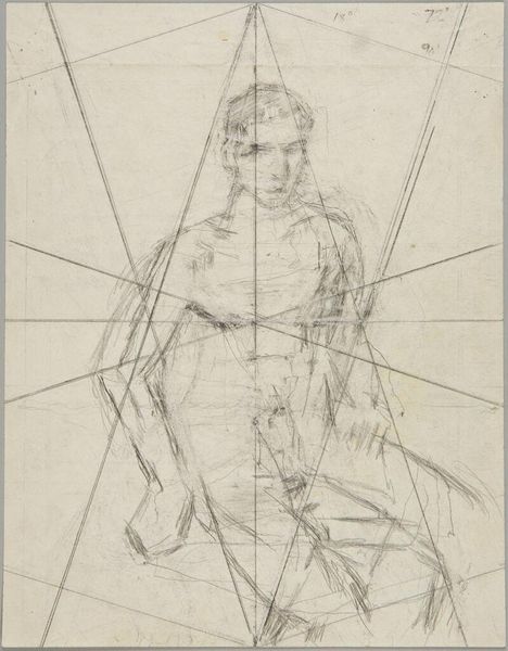 Curator: Here we have Denman Waldo Ross's "Seated Male Nude," a drawing at the Harvard Art Museums. Editor: My first thought is of a blueprint, something calculated, even architectural. It feels more about the process than the person. Curator: Absolutely. Ross was obsessed with systems, the idea that great art sprang from underlying mathematical harmonies. He's literally mapped this nude figure onto a grid derived from Renaissance principles. Editor: The inscription says it all, "The System of One and Two Squares Constantly Used by the Renaissance Masters." It's like he's reverse-engineering beauty. Does that lessen the humanity, though? Curator: Perhaps, but there's a certain elegance to seeing the structure beneath the surface, the quest for order and perfection. It speaks to a time when art aspired to universal ideals. I find it rather beautiful. Editor: I appreciate the attempt to codify beauty, but I'm still drawn to the raw, unquantifiable emotion in art. Still, it's fascinating to see the bones of a masterpiece laid bare.