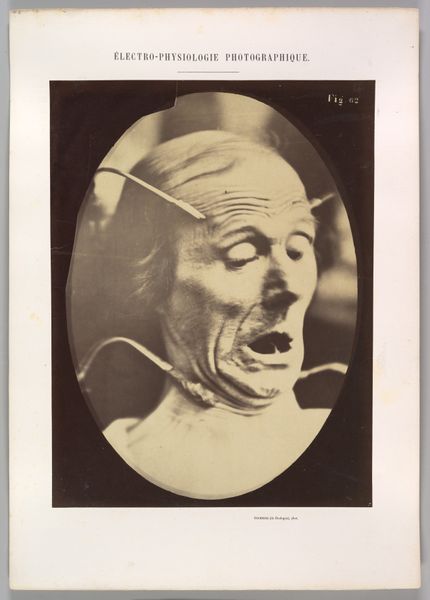 Editor: This is "Figure 54: Voluntary lowering of the lower jaw," a photograph taken between 1854 and 1856 by Guillaume Benjamin Amand Duchenne. The subject's expression is so arresting. What’s your take on this peculiar portrait? Curator: As a materialist, I immediately look to the process. Duchenne's project was rooted in scientific methodology; using photography as a tool to document and categorize human emotion through induced muscular contractions. Editor: Induced? So, the expression isn't natural? Curator: Exactly. He used electric currents to stimulate specific facial muscles. It’s important to consider the power dynamic here: Duchenne, the scientist, acting upon the body of the subject. The "voluntary" in the title becomes fraught. This wasn't about capturing natural expressions but dissecting them, reducing them to component parts. Editor: It makes the image much more unsettling, knowing it’s manufactured. What does this imply for our understanding of photography and its cultural context? Curator: It challenges the presumed objectivity of the photographic medium. Photography in this era was seen as a purely objective way to record. Duchenne is showing that the photograph can be manipulated, staged, used to reinforce ideas about science, about the body. Furthermore, it blurs the boundaries between science, art, and even spectacle. Who was this made for, and how was it consumed? Editor: So it’s less about the final image and more about the whole system of production that creates it? Curator: Precisely. The photographic process itself—the labor, the apparatus, the scientific theory – all become central to understanding what this image means and how it functions within the culture of the time. Editor: That definitely changes how I view the image. Now I'm more critical of the narrative around objective truth in image-making. Curator: Indeed, a crucial awareness for any student of art.