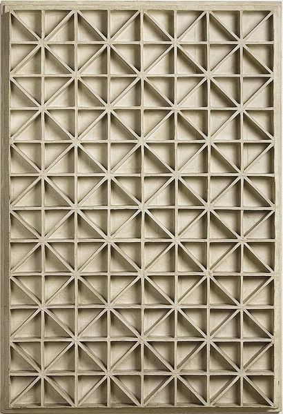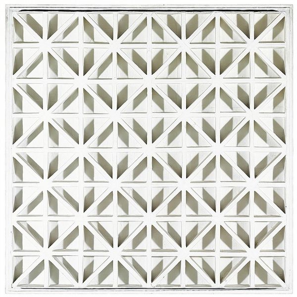 This is Johannes Jan Schoonhoven’s ‘Square Relief with Diagonals’, made with paint, probably white, and cardboard. The piece is all about process. I love how the cardboard has been built up, layer upon layer, to create this grid of diagonal lines and square shapes. There’s something so satisfying about the repetition of these forms. It’s almost meditative. Looking closely, you can see the texture of the cardboard, the way the paint sits on the surface, and the subtle variations in each square. None of them are exactly the same, which gives the piece a handmade, human quality. It's a relief, yet each of the small hollows cast a shadow that gives the piece depth. It reminds me of Agnes Martin's grids, but with a more tactile, sculptural feel. Schoonhoven’s work embraces the subtle imperfections and celebrate the act of making.