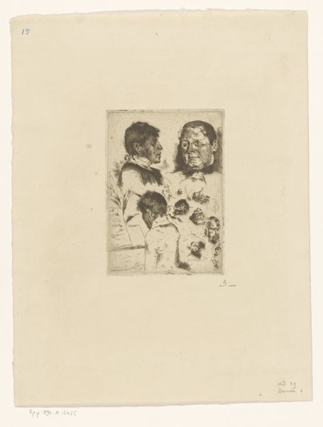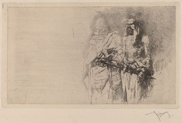 Curator: This pencil and ink drawing by Vicomte Arthur-Jean Le Bailly d'Inghuem, titled "Drie figuren met een hoofddoek", dates back to 1875. It’s a fascinating piece, particularly in the artist's exploration of representing different characters and genre scenes, which provide a lens into the 19th-century interest in portraying cultural diversity. Editor: Right, immediately, I'm struck by its intimate scale—it feels like peering into a secret sketchbook. And the mood! These aren’t formal portraits, are they? There's a kind of relaxed contemplation hanging in the air, almost melancholic. Curator: Precisely, they are less about specific identities and more about capturing types, focusing on the interplay of light and shadow across the figures’ faces and headscarves. This allowed d'Inghuem to engage with prevailing ideas of the ‘Orient’ while carefully navigating its visual representation within European art. Editor: It’s the light pencil work that really grabs me. The textures he creates with simple strokes give those headscarves a tactile quality – you can almost feel the fabric’s weight and folds. Is it me, or is there a real sense of immediacy, a kind of unfinished energy? Like a snapshot of thought itself. Curator: Definitely a piece to analyze not as a finished formal statement but more as an exploration of artistic vision, fitting well within the trend of Orientalism that saw European artists engaging with and interpreting Middle Eastern and North African cultures through their art, which both celebrated and, quite often, misrepresented those communities. Editor: Looking at the central figure with that pipe—it just pops. Maybe it is d'Inghuem giving us just enough to stoke our imagination. A cultural document certainly, but the emotion's in those sketches too, y'know? Curator: Agreed, and examining such artwork helps us better comprehend the artistic conventions and societal views prevalent during this epoch. It provides a point from which to observe, reflect on, and revise our cultural perspectives today. Editor: Beautifully said! It just leaves me wanting to pull up a chair and imagine the untold tales swirling around them... it kind of makes me want to draw, to try capturing a fleeting feeling, right here, right now.