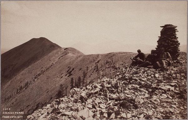 Editor: This photograph, titled "Picknickende mensen in het Corsicaanse berglandschap" or "Picnicking People in the Corsican Mountain Landscape", captured by Henry Pauw van Wieldrecht somewhere between 1886 and 1896. There's something about the almost faded realism that gives it a very intimate feel. It is located in the Rijksmuseum, by the way. How do you read this image, in terms of storytelling? Curator: Well, that's the charm, isn't it? It's almost voyeuristic. These figures frozen in time, enjoying a meal amidst the harsh beauty of the Corsican mountains. It's less a meticulously posed portrait, more a fleeting glimpse into someone's day – a ‘snapshot’ of a moment long gone, that we would share instantly now. The lighting and focus add a layer of mystique and, maybe a slight disconnect? The rugged terrain dominates, almost swallowing the people. Editor: It's funny you say that - I feel as though the harshness of the landscape might amplify how truly intimate a simple act like sharing a picnic with those closest must feel. What does that starkness represent for you? Curator: For me, that's the essence. Corsica isn't gentle; it's wild. And life then was likely tougher. The picnic becomes a pocket of civilization, a moment of respite snatched from the demands of the landscape. But there’s something beautiful and ephemeral about how the ‘genteel’ picnic-party stands in stark contrast to that… Doesn’t that resonate today? Do we steal time? Editor: Absolutely! It makes you think about how people throughout time crave connection and enjoyment, no matter their circumstances. Curator: Indeed! It's a universal desire framed within a very specific time and place. A thought I’ll cherish! Thank you.