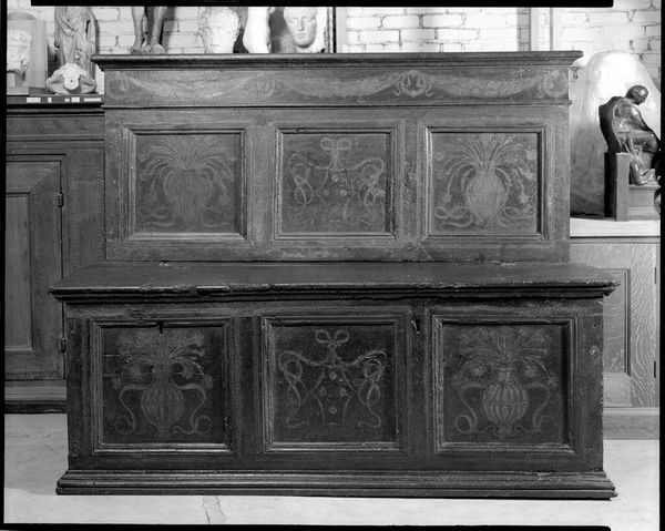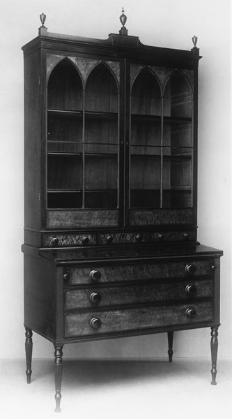 Curator: Here we have a piece titled "Secretary," crafted by an unidentified maker. Its monumental scale is immediately apparent. Editor: It looks like something you’d find in a haunted mansion—beautifully crafted, but definitely with a spooky vibe. Curator: Indeed, the robust curves of the drawers and the flamboyant shell motif at the top indicate a Baroque sensibility. Editor: All that ornamentation! Those handles look like little golden demons. Curator: The interplay of light and shadow across its surface enhances the wood grain's natural patterns. It's a testament to materiality. Editor: You know, it makes me wonder what secrets are hidden inside, what stories this piece could tell. Curator: A fine point! The piece's very existence prompts contemplations about history and legacy. Editor: And that, in itself, gives the "Secretary" its unique haunting beauty.
