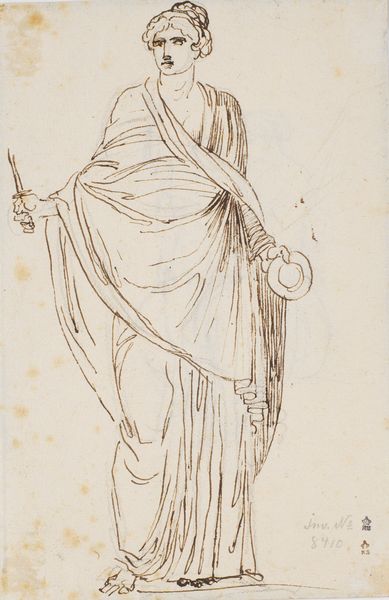 Editor: Here we have "Kristusskikkelse," or "Figure of Christ" created between 1810 and 1870 by Wilhelm Marstrand. It’s a pencil drawing on paper. I find it fascinating how the artist captured so much with so few lines. What can you tell me about the socio-political context of this piece? Curator: This drawing reflects the rise of Romanticism, which moved away from Neoclassical ideals and embraced emotion and spirituality. The image of Christ itself, regardless of religious belief, held powerful cultural and political weight, representing ideas of compassion, sacrifice, and moral authority, all concepts heavily debated at the time in Europe. Do you see any elements suggesting academic art practices? Editor: Yes, the attention to anatomical detail, even in a sketch, feels very studied. It’s not just an emotional outpouring; it's a carefully considered representation. Were these types of drawings often displayed publicly, or were they mostly for private study? Curator: That's a key question! Often, these preparatory drawings, especially those of religious figures, served dual purposes. They could be used for academic instruction in art schools to train artists in rendering the human figure. But these were also statements intended to show the capability of an artist. Publicly exhibiting them reinforced the artist's reputation. It also solidified the Church's influence, regardless of where you fell politically. How does knowing this influence how you view the work? Editor: It definitely changes my perspective. I was initially drawn to the perceived simplicity and vulnerability in this figure but now realize it may have served more purposes than that, and had greater political ramifications too. Curator: Exactly. Art rarely exists in a vacuum. Examining the social and institutional contexts illuminates its power. I feel I better understand the intersection between personal spiritual expression and public performance it embodies.