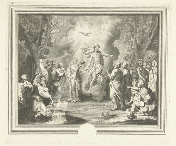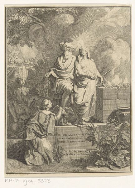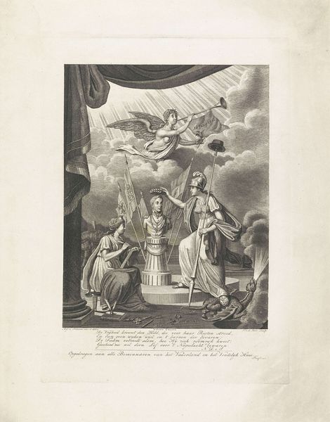 Editor: Here we have "Monument for the Third Centenary of the Reformation, 1517-1817," an engraving from 1817 currently held at the Rijksmuseum, attributed to Walraad Nieuwhoff. It's quite dense with symbolism, almost like a stage set. What's your take on it? Curator: Well, consider the context. This print commemorates the 300th anniversary of the Reformation. The figures aren't just decorative; they represent powerful socio-political and religious forces at play in the early 19th century. Who do you think the central female figure embodies? Editor: My first guess would be maybe an allegorical figure representing the Reformation itself? She seems to hold a book, perhaps the Bible? Curator: Precisely. The book signifies the importance of scripture in the Protestant movement. Notice how she stands triumphant over the figures below, suggesting the triumph of Protestantism over its opposition. The snake is definitely an interesting addition here! It creates quite an impact on the composition, wouldn’t you say? Editor: Yes, definitely! Now that you mention it, it's hard to ignore that snake being crushed at her feet. And what about the bust? Is that Martin Luther? Curator: Good eye! Indeed it is Luther, presented as a respected leader. What's interesting is how the monument itself is being presented, in the midst of idealized, almost fantastical imagery. It elevates the historical event to the level of myth. This points to the role imagery played in shaping public perception. It served not just to record but to construct a specific narrative. Editor: So it's less about historical accuracy and more about projecting a particular idea of the Reformation's legacy? Curator: Exactly. And that's where understanding the historical and socio-political background becomes crucial. Art, like this print, participates actively in the shaping of collective memory and the affirmation of societal values. Editor: That's really fascinating. I had been thinking about it only formally, but it’s incredible how much the context changes my understanding of the whole thing. Curator: Absolutely, and understanding art is as much understanding social history.