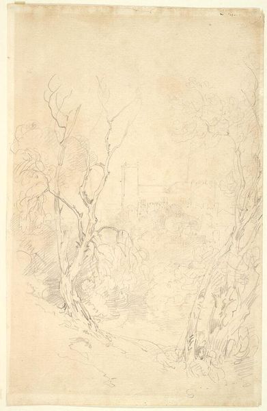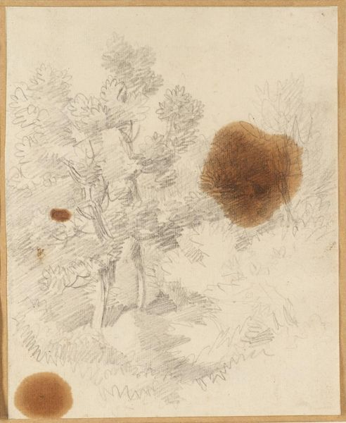 Editor: This is Thomas Stothard's "A Cave Surrounded by Trees." It's a small, monochromatic work. The composition seems to emphasize the darkness of the cave against the surrounding light. What strikes you most about its formal elements? Curator: The deliberate use of washes creates a sense of depth, drawing the eye toward the focal point. Notice how the artist employs contrasting textures to differentiate between the solid rock of the cave and the organic forms of the trees. The line work is rather expressive. Editor: It's interesting how the ambiguity of the forms almost blends the cave with the trees. Is that intentional, do you think? Curator: Perhaps. The dissolution of boundaries creates a visual tension, blurring the distinction between shelter and wilderness, inside and outside. It certainly evokes a sense of Romanticism in its treatment of the sublime. Editor: I hadn't thought about it that way. I see how the formal choices enhance the overall effect. Curator: Indeed, Stothard masterfully uses form to convey a mood that transcends mere representation.