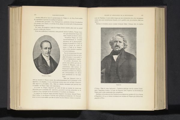 This is a photographic print of Élisée Reclus and a record of a meeting with Michel Eugène Chevreul, made by an anonymous photographer. The portraits and sequential photographs of discussions are presented across a double-page spread of an open book. What strikes me first is the calculated arrangement. The subjects are carefully placed to explore early applications of photography. Notice the stark contrast between the formal portraits at the top and the candid captures below. This juxtaposition highlights the shift from posed representation to capturing fleeting moments. The sequential images along the bottom demonstrate photography's ability to dissect time and motion, concepts which were revolutionary at the time. It's fascinating how the photographer uses the grid-like structure of the page to frame and categorize these images. This not only organizes the visual information, but also hints at underlying systems of knowledge and perception being developed through the medium of photography. It challenges our understanding of a fixed reality.