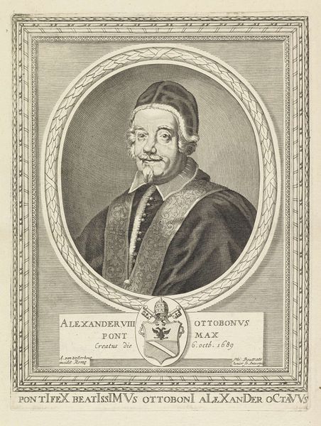 This is Nicolas de Larmessin's portrait of Pope Innocent XI, made using etching. It gives us insight into the representation of power and identity in the late 17th century. Innocent XI, born Benedetto Odescalchi, was known for his austerity and efforts to reform the Catholic Church. Consider how the print may embody or challenge the ideas of leadership. The choice to create a print, meant for wider distribution, speaks to the strategic importance of image-making in shaping public perception and reinforcing the Church's authority. The artistic choices, from the framing to the detailed rendering of Innocent XI's features and papal garments, invite reflection on the construction of identity. How might his policies and beliefs affect the cultural and social norms of the time? The portrait serves as a lens through which we can examine the intersections of religious authority, artistic representation, and cultural identity in a period marked by significant social and political upheaval.